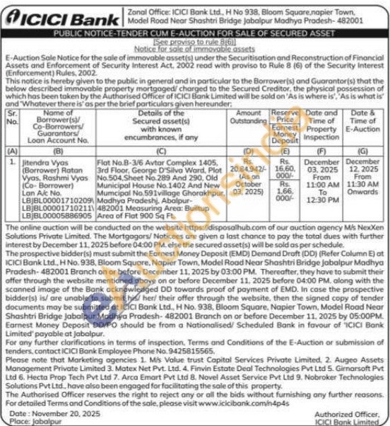 Flat No.B-3/6 Avtar Complex 1405, 3rd Floor, George D'Silva Ward. Plot No.504, Sheet No. 289 And 290, Old Municipal House No.1402 And New Mumcipal No. 591 village Ghorakhpur, Madhya Pradeshi, Abalpur-482001 Measuring Area: Builtup Area of Flat 900 Sq Ft.