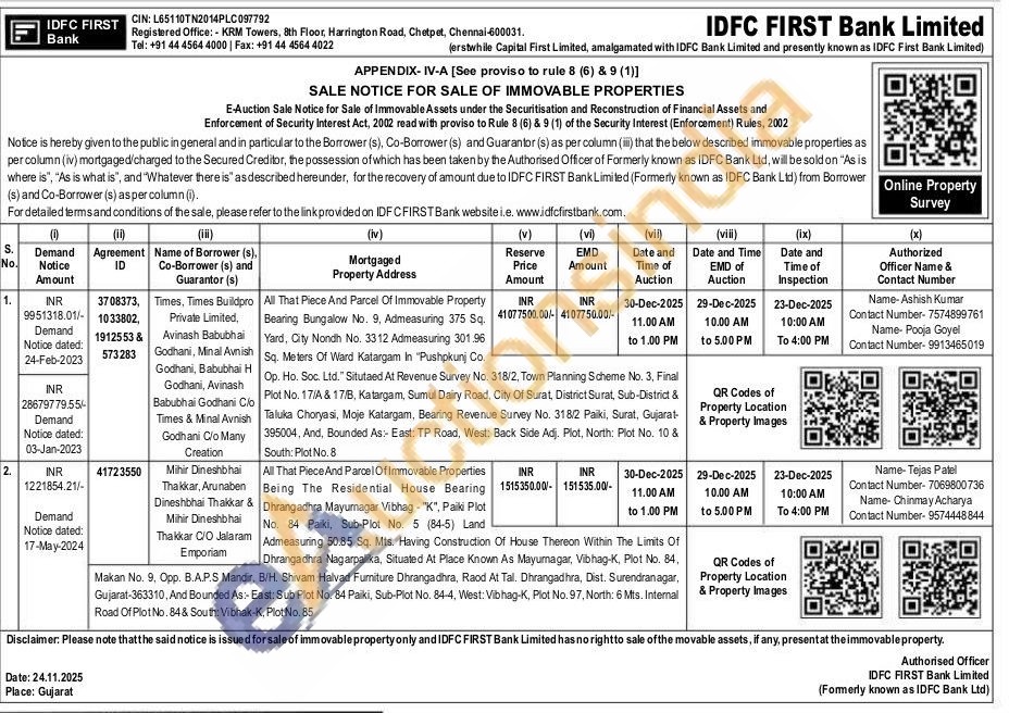 All That Piece And Parcel Of Immovable Properties Being The Residential House Bearing Dhrangadhra Mayurnagar Vibhag - "K", Paiki Plot No. 84 Paiki, Sub-Plot No. 5 (84-5) Land Admeasuring 50.85 Sq. Mts. Having Construction Of House Thereon Within The Limits Of Dhrangadhra Nagarpalika, Situated At Place Known As Mayurnagar, Vibhag-K, Plot No. 84, Makan No. 9, Opp. B.A.P.S Mandir, B/H. Shivam Halvad Fumiture Dhrangadhra, Raod At Tal. Dhrangadhra, Dist. Surendranagar, Gujarat-363310, And Bounded As:- East: Sub Plot No. 84 Paiki, Sub-Plot No. 84-4, West: Vibhag-K, Plot No. 97, North: 6 Mts. Internal Road Of Plot No. 84 & South: Vibhak-K, Plot No. 85