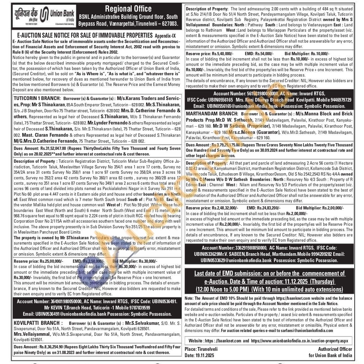 2) The land admeasuring 2.00 cents with a building of 484 sq ft situated at S.No 214/1B Door No 51/4 North Street, Pandayarmangalam Village, Kovilpati Taluk, Tuticorin Revenue district, Kovilpatti Sub Registry, Palayamkottai Registration District owned by Mrs S Vellaiyammal Boundaries: North: Pathway South Land belongs to Vedanayagam East: Land belongs to Rathinam West:Land belongs to Mariappan Particulars of the property/asset (viz. extent & measurements specified in the E-Auction Sale Notice) have been stated to the best of information of the Authorized Officer and Authorized Officer shall not be answerable for any error, misstatement or omission. Symbolic extent & dimensions may differ