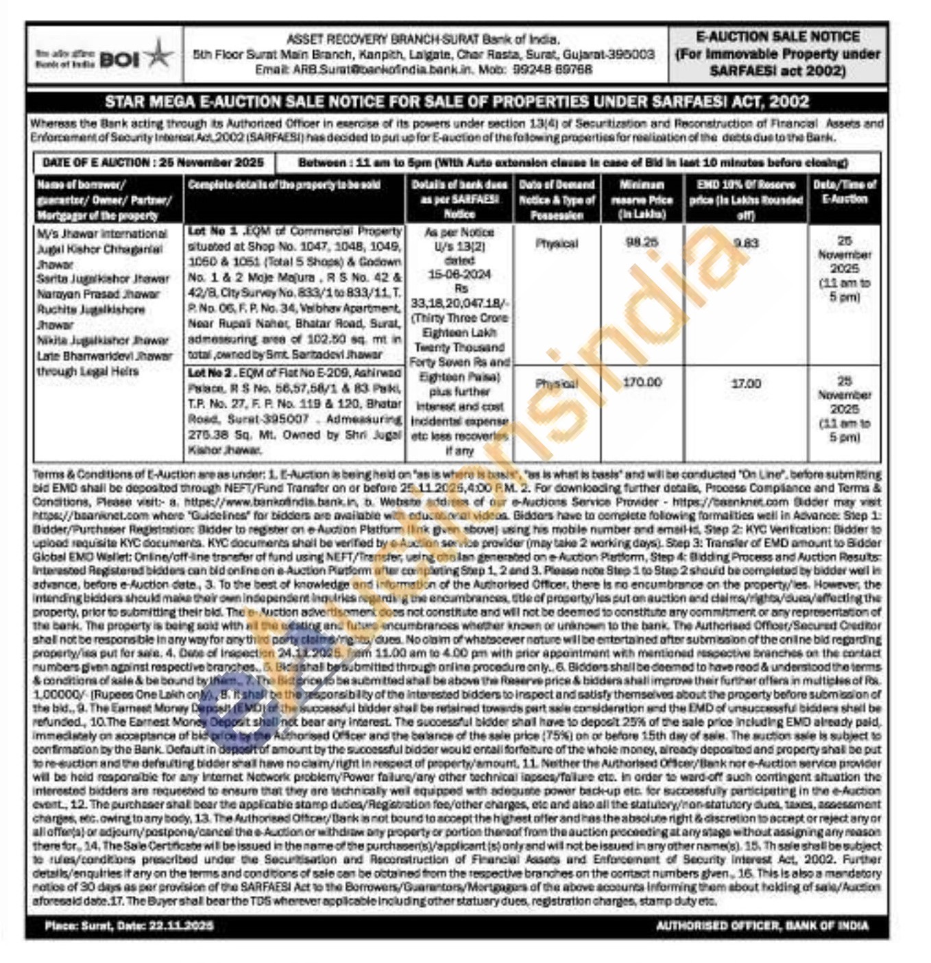 Lot No 1 EQM of Commercial Property situated at Shop No. 1047, 1048, 1049, 1060 & 1051 (Total 5 Shops) & Godown No. 1 & 2 Moje Majura. RS No. 42 & 42/8, City Survey No. 833/1 to 833/11.Т. P. No. 06, F. P. No. 34, Welbhav Apartment, Near Rupali Naher, Bhatar Road, Surat, admessuring aree of 102.50 sq. mt in total, owned by Smt. Sartadevi Jhawar
