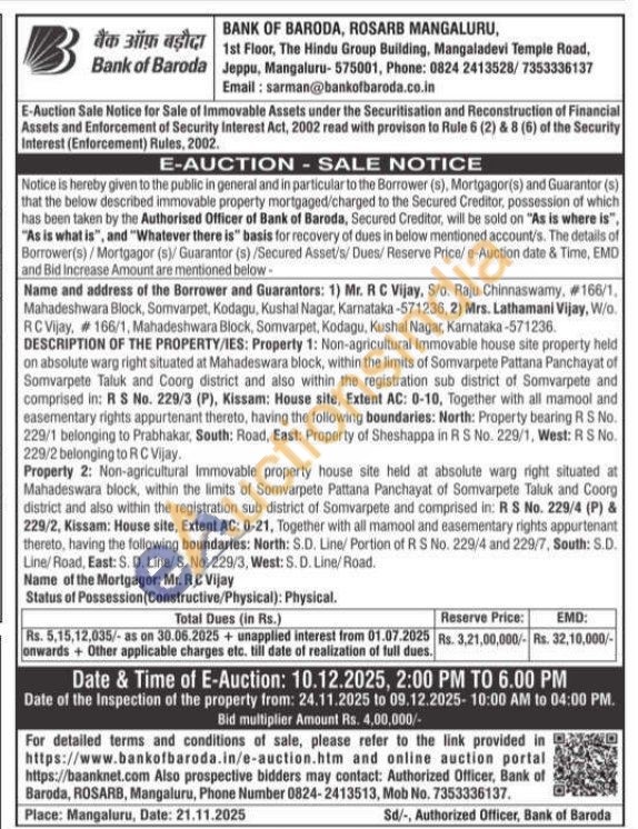 DESCRIPTION OF THE PROPERTY/IES: Property 1: Non-agricultural Immovable house site property held on absolute warg right situated at Mahadeswara block, within the limits of Somvarpete Pattana Panchayat of Somvarpete Taluk and Coorg district and also within the registration sub district of Somvarpete and comprised in: R S No. 229/3 (P), Kissam: House site, Extent AC: 0-10, Together with all mamool and easementary rights appurtenant thereto, having the following boundaries: North: Property bearing R S No. 229/1 belonging to Prabhakar, South: Road, East: Property of Sheshappa in RS No. 229/1, West: R S No. 229/2 belonging to RC Vijay. Property 2: Non-agricultural Immovable property house site held at absolute warg right situated at Mahadeswara block, within the limits of Somvarpete Pattana Panchayat of Somvarpete Taluk and Coorg district and also within the registration sub district of Somvarpete and comprised in: R S No. 229/4 (P) & 229/2, Kissam: House site, Extent AC: 0-21, Together with all mamool and easementary rights appurtenant thereto, having the following boundaries: North: S.D. Line/ Portion of R S No. 229/4 and 229/7, South: S.D. Line/Road, East: S. D. Line/S. No. 229/3, West: S. D. Line/Road. Name of the Mortgagor: Mr. R C Vijay
