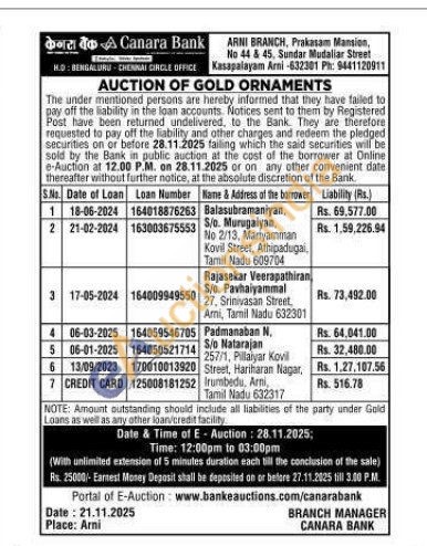 Canara Bank Gold Auctions Auction in Tiruvannamalai
