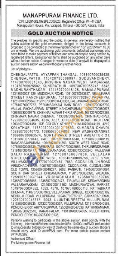 Manappuram Finance Ltd Gold Auctions Auction in Chengalpattu