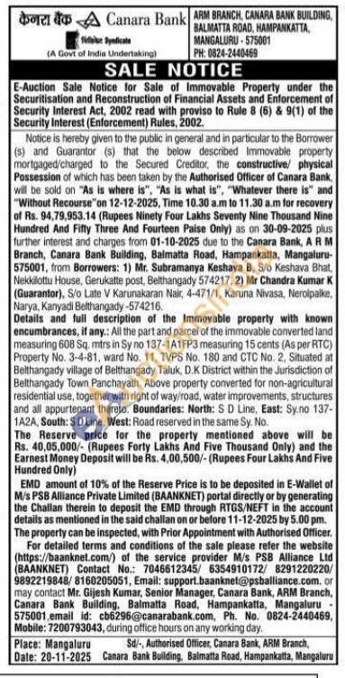 Details and full description of the Immovable property with known encumbrances, if any.: All the part and parcel of the immovable converted land measuring 608 Sq. mtrs in Sy no 137-1A1FP3 measuring 15 cents (As per RTC) Property No. 3-4-81, ward No. 11, TVPS No. 180 and CTC No. 2, Situated at Belthangady village of Belthangady Taluk, D.K District within the Jurisdiction of Belthangady Town Panchayath. Above property converted for non-agricultural residential use, together with right of way/road, water improvements, structures and all appurtenant thereto. Boundaries: North: SD Line, East: Sy.no 137-1A2A, South: SD Line, West: Road reserved in the same Sy. No.