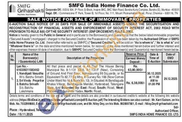 All that piece and parcel of All That The House Bering Municipal No. 8-1-131 (Old), 8-1-131/F (New), Consisting of Ground And First Floor, Admeasuring 99 Sq.yards, or its Equivalent To 82.77 Sq Mtrs, In Survey No. 166 (Now Comes Under Ward No 18 & Block No. 13), In Situated At Bandlaguda Khalsa Village, Bandiaguda Mandal, Hyderabad, Telangana State, And Bounded By: East: Road, South: Road, West: Portion of T. Surender Yadav, North: Road.