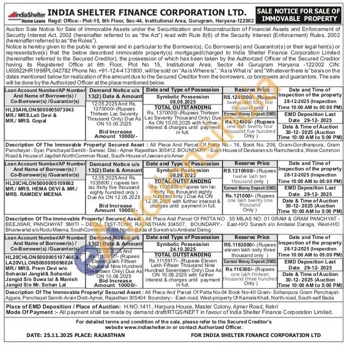 Description Of The Immovable Property/ Secured Asset: All Piece And Parcel Of Patta No-04 Book No-40 Gram-Sohanpura Gram Panchayat-Ajgara, Panchayat Samiti-Arain Distt-Ajmer, Rajasthan 305404 Boundary:- East-road, West-property Of Kamala Khati, North-road, South-self Bada