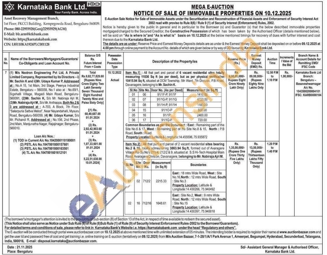 Item No.11: All that part and parcel of 6 vacant residential sites totally measuring 11036 Sq ft (as per deed), but as per physical verification 10415.94 Sq ft, situated at DCM Township, 5th Ward, 7th Division, P.B Road, Davanagere, belonging to Mr. Sachin K.