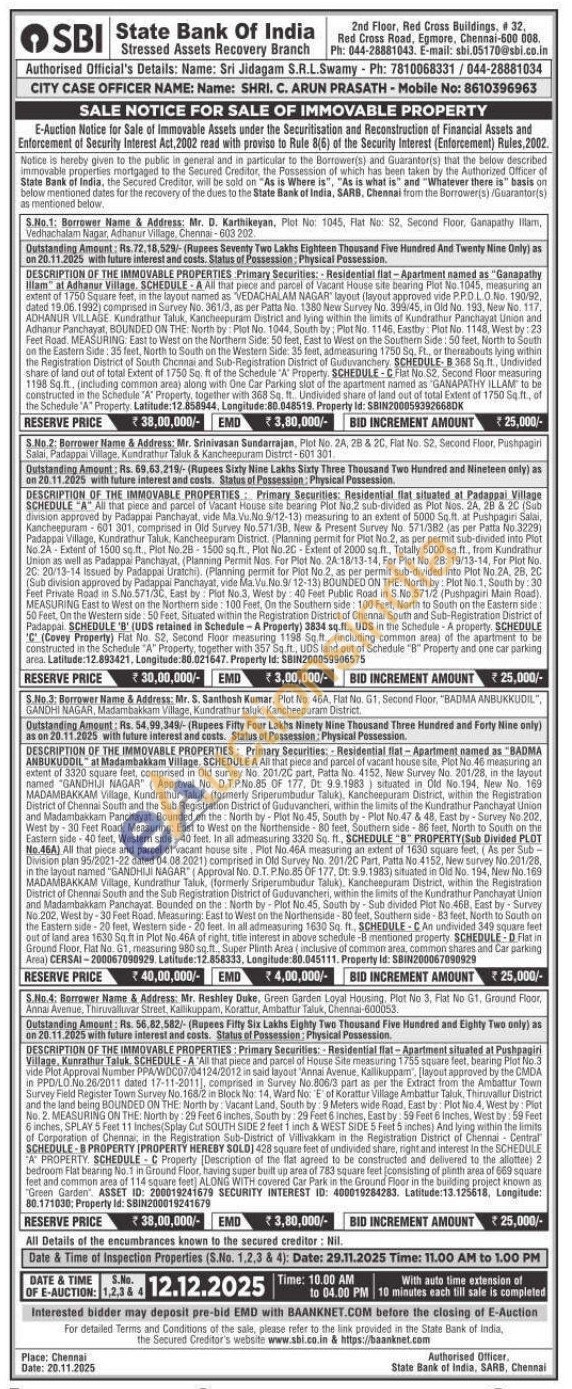 DESCRIPTION OF THE IMMOVABLE PROPERTIES: Primary Securities: - Residential flat-Apartment named as "BADMA ANBUKUDDIL at Madambakkam Village, SCHEDULE A All that piece and parcel of vacant house site, Plot No.46 measuring an extent of 3320 square feet, comprised in Old survey No. 201/20 part, Patta No. 4152, New Survey No. 201/28, in the layout named "GANDHIJI NAGAR (Approval No. D.T.P.No.85 OF 177. Ot 9.9.1983) situated in Old No.194, New No. 169 MADAMBAKKAM Village, Kundrathur Taluk, (formerly Sriperumbudur Taluk), Kancheepuram District, within the Registration District of Chennai South and the Sub Registration District of Guduvancheri, within the limits of the Kundrathur Panchayat Union and Madambakkam Panchayat. Bounded on the North by Plot No.45, South by-Plot No.47 & 48, East by Survey No 202, West by-30 Feet Road. Measuring: East to West on the Northenside 80 feet, Southern side-86 feet, North to South on the Eastern side-40 feet, Western side-40 feet. In all admeasuring 3320 Sq. ft., SCHEDULE "B" PROPERTY(Sub Divided PLOT No.46A) All that piece and parcel of vacant house site, Plot No. 46A measuring an extent of 1630 square feet, (As per Sub-Division plan 95/2021-22 dated 04.08.2021) comprised in Old Survey No. 201/20 Part, Patta No.4152, New survey No.201/28, in the layout named "GANDHIJI NAGAR" (Approval No. D.T. P.No.85 OF 177, Dt: 9.9.1983) situated in Old No. 194, New No. 169 MADAMBAKKAM Village, Kundrathur Taluk, (formerly Sriperumbudur Taluk), Kancheepuram District, within the Registration District of Chennai South and the Sub Registration District of Guduvancheri, within the limits of the Kundrathur Panchayat Union and Madambakkam Panchayat Bounded on the North by-Plot No.45, South by-Sub divided Plot No 468, East by-Survey No.202, West by-30 Feet Road, Measuring: East to West on the Northenside-80 feet, Southern side-83 feet, North to South on the Eastern side 20 feet, Western side-20 feet. In all admeasuring 1630 Sq. ft., SCHEDULE-C An undivided 349 square feet out of land area 1630 Sq.ft in Plot No.46A of right, title interest in above schedule -B mentioned property. SCHEDULE-D Fist in Ground Floor, Flat No. 61, measuring 980 sq.ft., Super Plinth Area (inclusive of common area, common shares and Car parking Area) CERSAI-200067090929. Latitude: 12.858333, Longitude:80.045111. Property Id: SBIN200067090929