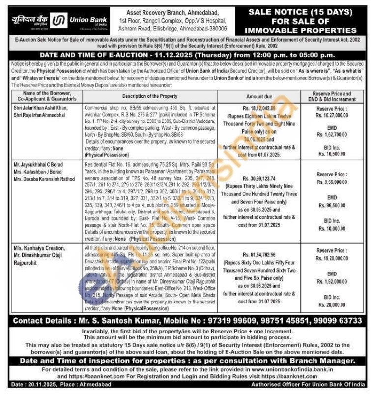 All that piece and parcel of property being office No. 214 on second floor, admeasuring 445 Sq. Fts ie 41.35 sq. mts. Super built-up area of Devashish Arcade, situated on the land bearing Final Plot No. 122/paki (allotted in lieu of Survey/Block No. 258/A), T.P Scheme No. 3 (Odhav). Taluka Vatva, in the registration district Ahmedabad & Sub-district Ahmedabad-07 (Odhav) in name of Mr. Dineshkumar Otaji Rajpurohit and bounded by following boundaries: East-Office No. 213. West-Office No. 215. North-Passage of said Arcade, South- Open Metal Sheds Details of encumbrances over the property, as known to the secured creditor, if any: None (Physical Possession)