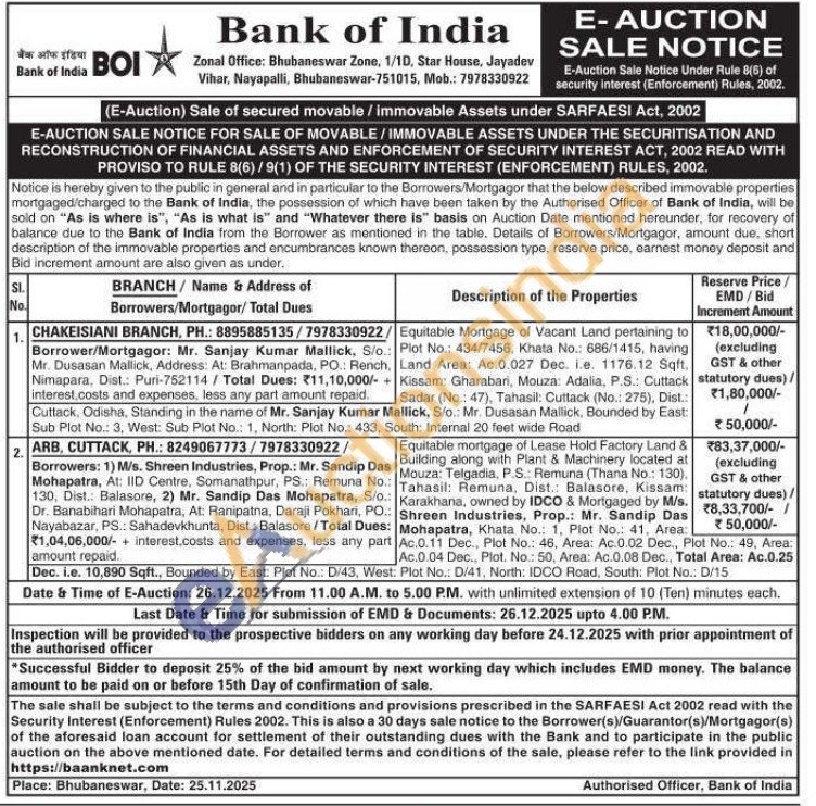 Equitable Mortgage of Vacant Land pertaining to Plot No.: 434/7456, Khata No.: 686/1415, having Land Area: Ac.0.027 Dec. i.e. 1176.12 Sqft, Kissam: Gharabari, Mouza: Adalia, P.S.: Cuttack Sadar (No.: 47), Tahasil: Cuttack (No.: 275), Dist.: Cuttack, Odisha, Standing in the name of Mr. Sanjay Kumar Mallick, S/o.: Mr. Dusasan Mallick, Bounded by East: Sub Plot No.: 3, West: Sub Plot No.: 1, North: Plot No.: 433, South: Internal 20 feet wide Road