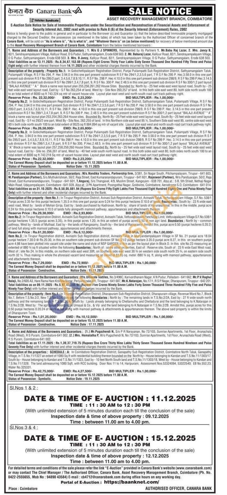 Description of the properties: SCHEDULE: A: In Coimbatore Registration District, Ganapathy Sub Registration District, Coimbatore North Taluk, Ganapathy Village, in T.S.No.11/1327 an extent of 1080 Sq.ft with residential building thereon bounded on the North by-House belonging to Kandan and T.S.No. 11/1303/17, South by House belonging to Kandan and T.S.No. 11/1323, East by 10 feet North South land and T.S.No. 11/1303/18, West by-House belonging to Kandan and T.S.No.11/1328. The land admeasuring 1080 Sqft. with RCC building. Door Nos 11 to 14, Haripuram: Assessment Nos. 53324094, 53322540; EB No.552,23, Water No.325331.