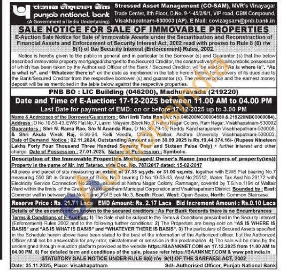 All piece and parcel of site measuring an extent of 37.33 sq.yds. or 31.00 sq.mts. together with EWS Flat bearing No.7 measuring 550 Sft in Ground Floor of Block No.3 bearing D.No. 10-53-43, Asst. No.25512, Water Tax Asst.No.29172 with Electricity Service Connection No.29153, situated at Nehru Nagar Colony, Ramnagar, covered by T.S.No.1194 of Waltair Ward within the limits of the Greater Visakhapatnam Municipal Corporation and Visakhapatnam District. Bounded by: East: Common wall in between Flat Nos. 1 and 7 of Block No. 3. South: Road, West: Open Space, North: Common Staircase.