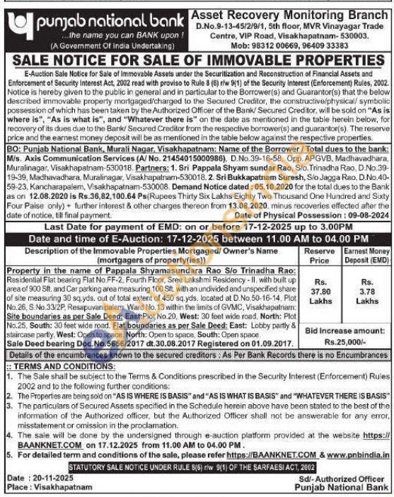 Residential Flat bearing Flat No FF-2, Fourth Floor, Sree Lakshmi Residency-II, with built up area of 900 Sft. and Car parking area measuring 100 Sit. with an undivided and unspecified share of site measuring 30 sq.yds, out of total extent of 450 sq.yds, located at D.No.50-16-14, Plot No.26, S.No.33/2P, Resapuvanipalen, Ward No. 13 within the limits of GVMC, Visakhapatnam: Site boundaries as per Sale Deed: East:Plot No.20, West: 30 feet wide road. North: Plot No.25, South: 30 feet wide road. Flat boundaries as per Sale Deed: East: Lobby partly & staircase partly, West: Open to space, North: Open to space, South: Open space