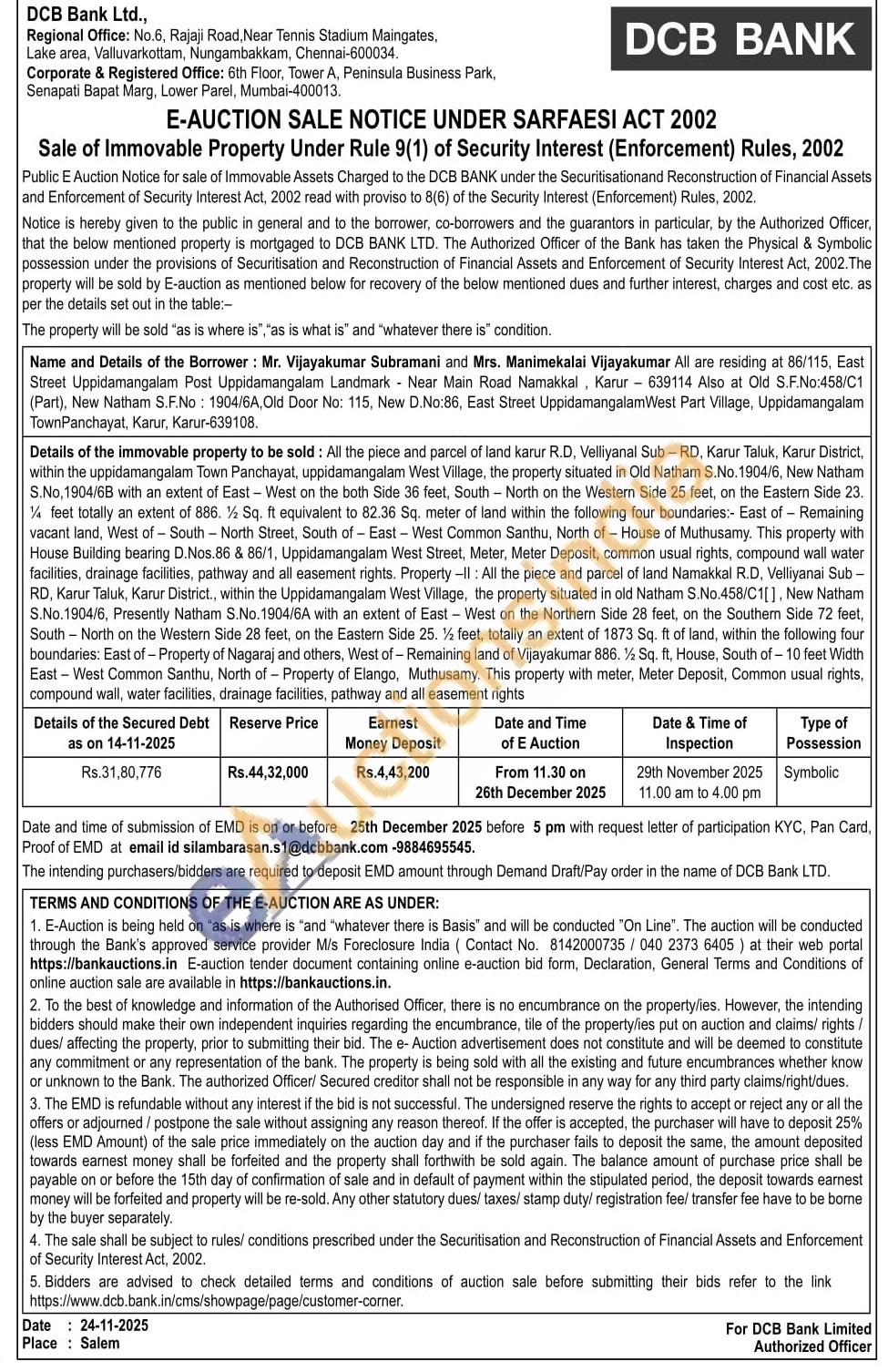 Details of the immovable property to be sold: All the piece and parcel of land karur R.D, Velliyanal Sub-RD, Karur Taluk, Karur District, within the uppidamangalam Town Panchayat, uppidamangalam West Village, the property situated in Old Natham S.No. 1904/6, New Natham S.No. 1904/6B with an extent of East-West on the both Side 36 feet, South-North on the Western Side 25 feet, on the Eastern Side 23. ¼ feet totally an extent of 886. ½ Sq. ft equivalent to 82.36 Sq. meter of land within the following four boundaries:- East of - Remaining vacant land, West of South-North Street, South of East-West Common Santhu, North of House of Muthusamy. This property with House Building bearing D. Nos.86 & 86/1, Uppidamangalam West Street, Meter, Meter Deposit, common usual rights, compound wall water facilities, drainage facilities, pathway and all easement rights. Property-II: All the piece and parcel of land Namakkal R.D, Velliyanai Sub-RD, Karur Taluk, Karur District., within the Uppidamangalam West Village, the property situated in old Natham S.No.458/C1[], New Natham S.No. 1904/6, Presently Natham S.No. 1904/6A with an extent of East-West on the Northern Side 28 feet, on the Southern Side 72 feet, South-North on the Western Side 28 feet, on the Eastern Side 25. % feet, totally an extent of 1873 Sq. ft of land, within the following four boundaries: East of-Property of Nagaraj and others, West of-Remaining land of Vijayakumar 886. ½ Sq. ft, House, South of-10 feet Width East-West Common Santhu, North of Property of Elango, Muthusamy. This property with meter, Meter Deposit, Common usual rights, compound wall, water facilities, drainage facilities, pathway and all easement rights
