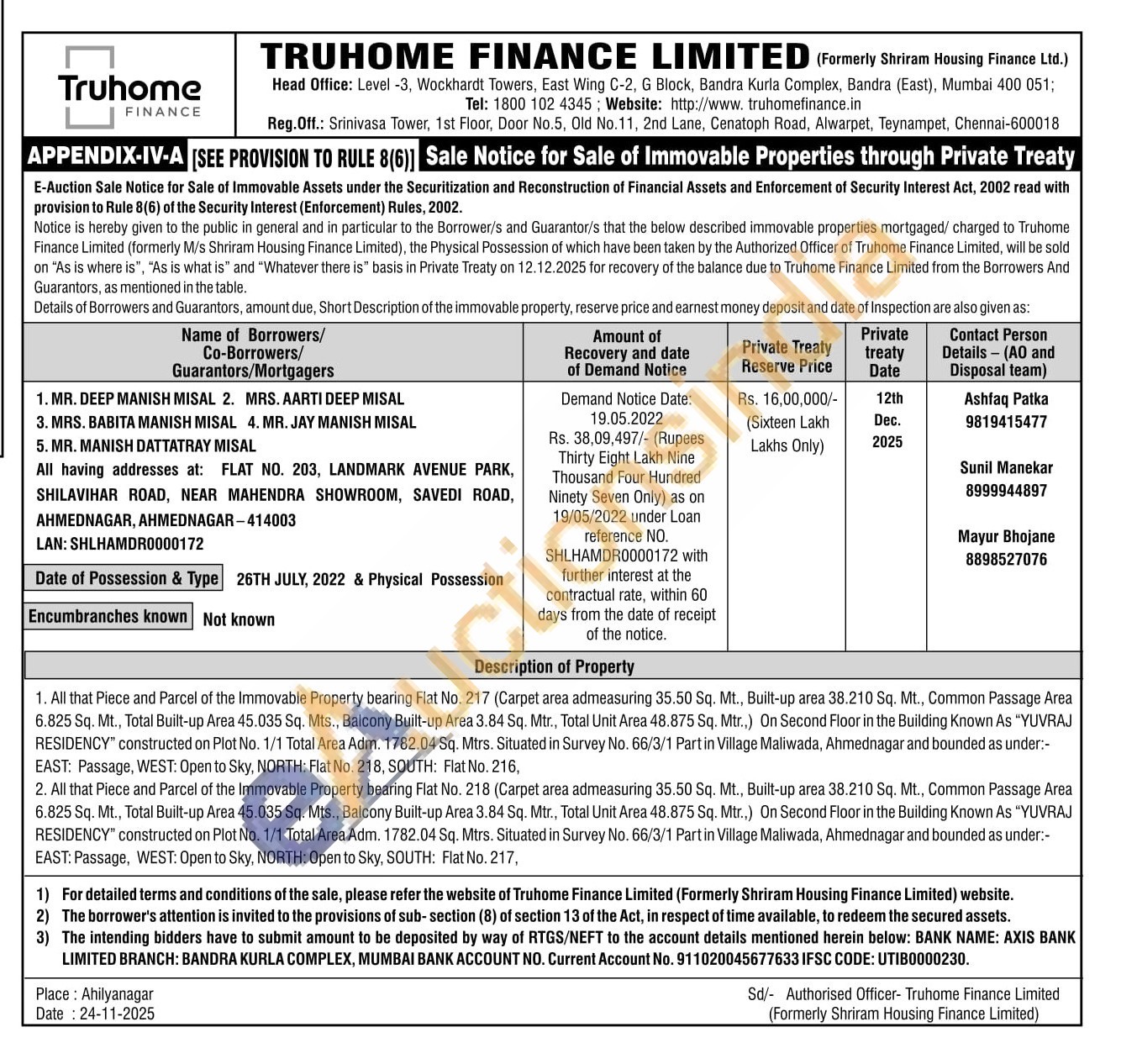 All that Piece and Parcel of the Immovable Property bearing Flat No. 217 (Carpet area admeasuring 35.50 Sq. Mt., Built-up area 38.210 Sq. Mt., Common Passage Area 6.825 Sq. Mt., Total Built-up Area 45.035 Sq. Mts., Balcony Built-up Area 3.84 Sq. Mtr., Total Unit Area 48.875 Sq. Mtr.,) On Second Floor in the Building Known As "YUVRAJ RESIDENCY" constructed on Plot No. 1/1 Total Area Adm. 1782.04 Sq. Mtrs. Situated in Survey No. 66/3/1 Part in Village Maliwada, Ahmednagar and bounded as under:-EAST: Passage, WEST: Open to Sky, NORTH: Flat No. 218, SOUTH: Flat No. 216, 2. All that Piece and Parcel of the Immovable Property bearing Flat No. 218 (Carpet area admeasuring 35.50 Sq. Mt., Built-up area 38.210 Sq. Mt., Common Passage Area 6.825 Sq. Mt., Total Built-up Area 45.035 Sq. Mts., Balcony Built-up Area 3.84 Sq. Mtr., Total Unit Area 48.875 Sq. Mtr.,) On Second Floor in the Building Known As "YUVRAJ RESIDENCY" constructed on Plot No. 1/1 Total Area Adm. 1782.04 Sq. Mtrs. Situated in Survey No. 66/3/1 Part in Village Maliwada, Ahmednagar and bounded as under:-EAST: Passage, WEST: Open to Sky, NORTH: Open to Sky, SOUTH: Flat No. 217,