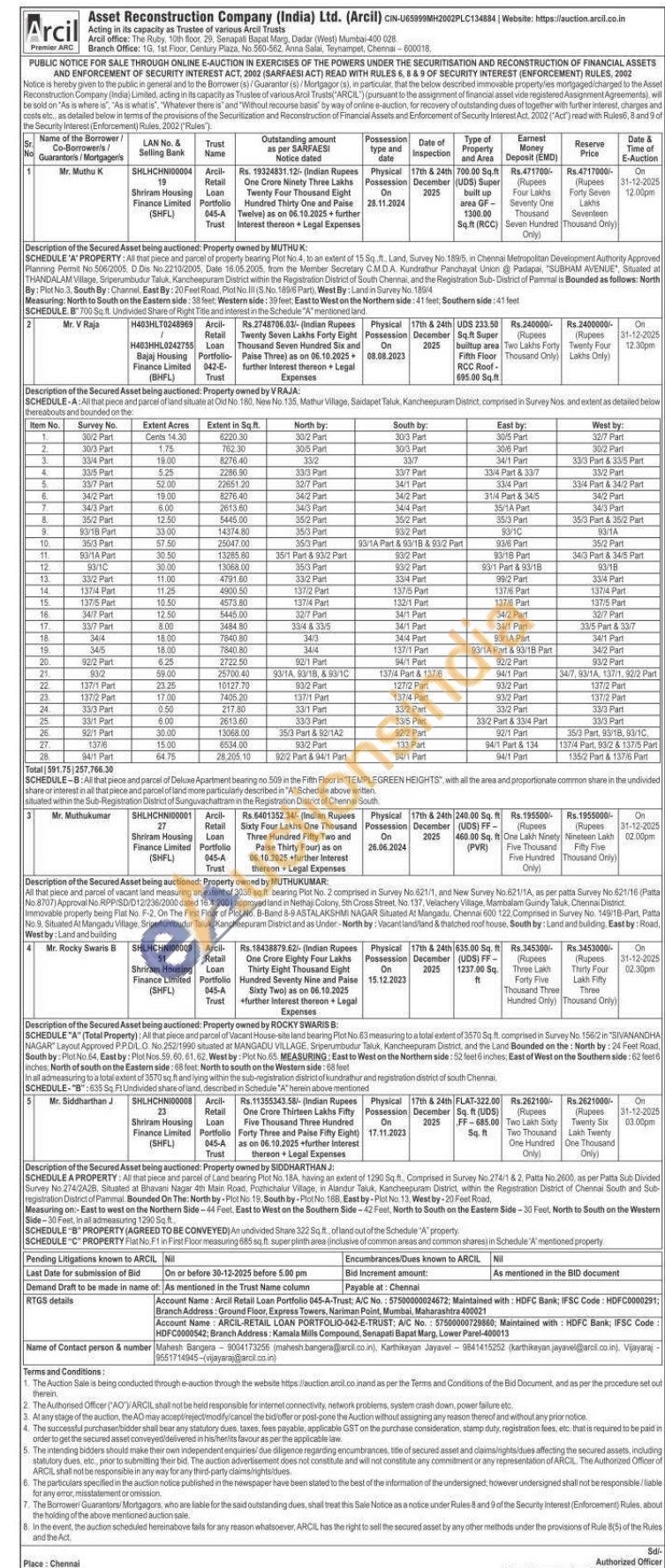 Description of the Secured Asset being auctioned: Property owned by MUTHUK: SCHEDULE 'A' PROPERTY: All that piece and parcel of property bearing Plot No.4, to an extent of 15 Sq.ft, Land, Survey No. 189/5, in Chennai Metropolitan Development Authority Approved Planning Permit No 506/2005. D.Ds No 2210/2005, Date 16.05.2005, from the Member Secretary CMD.A. Kundrathur Panchayat Union @ Padapai, "SUBHAM AVENUE, Situated at THANDALAM Village, Sriperumbudur Taluk, Kancheepuram District within the Registration District of South Chernal, and the Registration Sub-District of Pammal is Bounded as follows: North By: Plot No.3, South By: Channel, East By: 20 Feet Road, Plot No Iil (S.No. 189/6 Part), West By: Land in Survey No. 189/4 Measuring: North to South on the Eastern side: 38 feet Western side: 39 feet East to West on the Northern side: 41 feet, Southern side: 41 feet