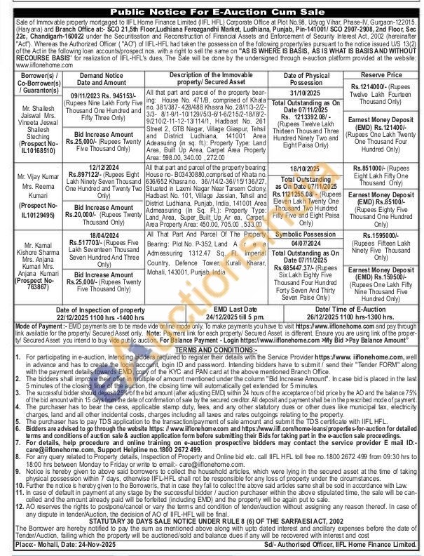 All that part and parcel of the property bear-ing House No. 471/B, comprised of Khala Total Outstanding as On по. 381/387-428/488 Khasra No. 28/11/3-2/2-3/3-8/1-9/1-10/129/5/3-6/1-6/215/2-18/8/2-9/210/2-11-12-13/114/1, Hadbast No. 261 Street 2, GTB Nagar, Village Giaspur, Tehsil and District Ludhiana, 141001 Area Adeasuring in sq. ft.): Property Type: Land Area, Bult Up Area, Carpet Area Property Area: 598.00, 340.00,272.00
