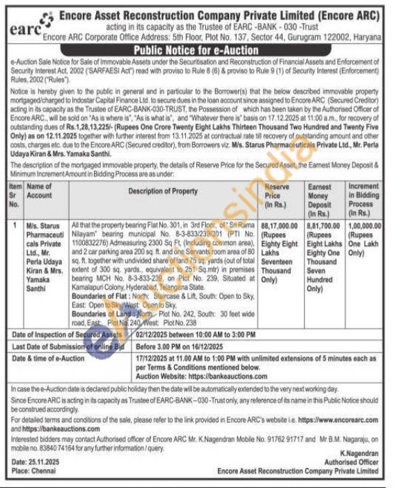 All that the property bearing Flat No. 301, in 3rd Floor, of Sri Rama Nilayam bearing municipal No. 8-3-833/239/301 (PTI No. 1100832276) Admeasuring 2300 Sq Ft. (Including common area). and 2 car parking area 200 sq. ft. and one Servants room area of 80 sq. ft. together with undivided share of land 75 sq. yards (out of total extent of 300 sq yards, equivalent to 251 Sq.mtr) in premises bearing MCH No. 8-3-833-239, on Plot No. 239, Situated at Kamalapur Colony, Hyderabad, Telangana State Boundaries of Flat: North: Staircase & Lift, South. Open to Sky, East: Open to Sky, West: Open to Sky,Boundaries of Land: North: Plot No. 242, South: 30 feet wide road, East: Plot No. 240, West. Plot No. 238