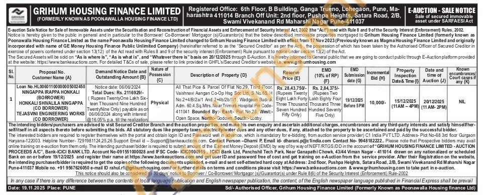 All That Pice & Parcel Of Flat No.29, Third Floor, Vaishnavi Aangan Co-Op Hsg Sac Lid, S No.65, H No.2+4/B/2a/1 And 2+4b/2b/1/1, Wadgaon Budruk Adm. 60.4.Sq. Mtrs. Near Trimurti Hospital Pin Code-411041 Bounded By:- East:- Flat No.28, West: Open Space, North:- Godown, South:- Lobby