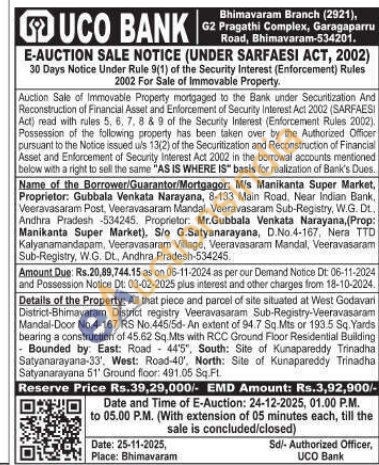 Details of the Property: All that piece and parcel of site situated at West Godavari District-Bhimavaram District registry Veeravasaram Sub-Registry-Veeravasaram Mandal-Door No.4-167 RS No.445/5d-An extent of 94.7 Sq.Mts or 193.5 Sq. Yards bearing a construction of 45.62 Sq.Mts with RCC Ground Floor Residential Building Bounded by East: Road 44'5", South: Site of Kunapareddy Trinadha Satyanarayana-33', West: Road-40', North: Site of Kunapareddy Trinadha Satyanarayana 51' Ground floor: 491.05 Sq. Ft.
