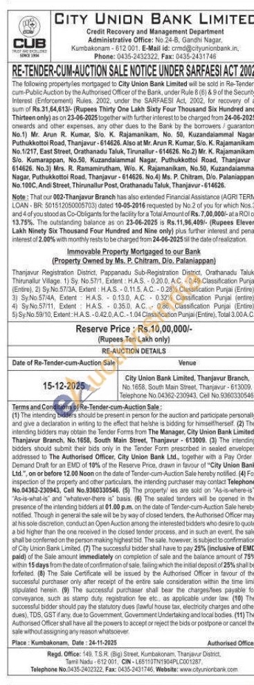Thanjavur Registration District, Pappanadu Sub-Registration District, Orathanadu Taluk Thirunallur Village. 1) Sy. No 57/1, Extent: H.A.S.-0.20.0.A.C.-0.49 Classification Punja (Entire), 2) Sy.No 57/3A. Extent: H.A.S-0.115.A.C.-0.28% Classification Punjai (Entire) 3) Sy No 57/4A, Extent HAS.0.13.0, A.C.0.3219 Classification Punjal (entire) 4) Sy No.57/11, Extent HAS 0.35.0, AC 0.86, Classification Punjai (Entire) 5) Sy No.59/10, Extent: H.A.S.-0.42.0.A.C.-1.04 Classification Punjai (Entire), Total 3.00A.C