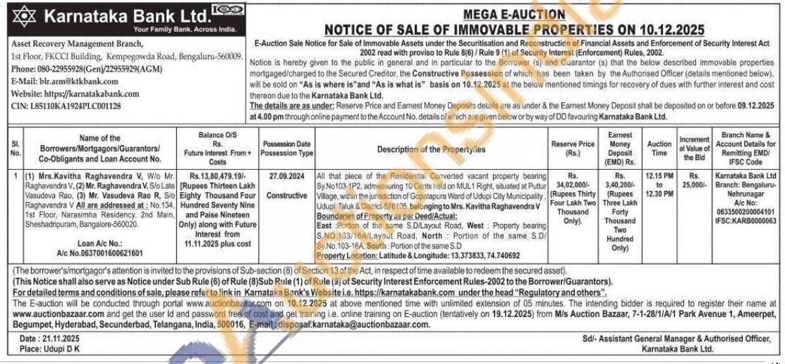 All that piece of the Residential Converted vacant property bearing Sy No103-1P2, admeasuring 10 Cents held on MUL1 Right, situated at Puttur Village, within the jurisdiction of Gopalapura Ward of Udupi City Municipality, Udupi Taluk & District-576105, belonging to Mrs. Kavitha Raghavendra V Boundaries of Property as per Deed/Actual:East Portion of the same S.DiLayout Road, West Property bearing S.NO. 103/16A/Layout Road, North Portion of the same SD Sy.No. 103-16A, South: Portion of the same S.D Property Location: Latitude & Longitude: 13.373833, 74.740692