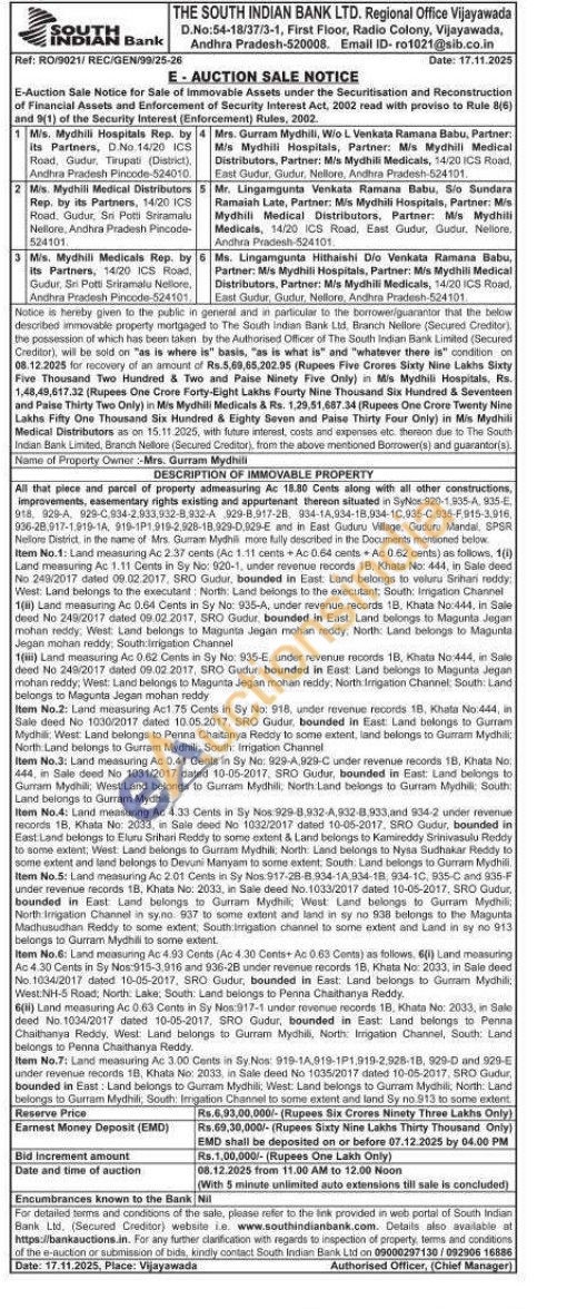 All that piece and parcel of property admeasuring Ac 18.80 Cents along with all other constructions, Improvements, easementary rights existing and appurtenant thereon situated in SyNos 920-1.835-A, 935-918, 029-A. 929-C034-2.833.932-8.932-A 929-8.917-28, 034-14.934-18.934-10.035-C035-F915-3916 936-28.917-1919-14 919-191919-2.926-18.929-0329-E and in East Guduru Villag Nellore District, in the name of Mrs. Guram Mydhik more fully desortbest in the Documents mentioned betw Item No.1: Land measuring Ac 2.37 cents (Ac 1.11 cents Ac 0.64 cents Ac 0.62 cents) as follows. 1(1) Land meassuring Ac 1.11 Cents in By No: 920-1, under revenue records 18. Khate No: 444, in Sale deed No 249/2017 dated dated 09.02.2017, SRO Gudur, bo Gudur, bounded in East Land belongs to veluru Srihan reddy: West Land belongs to the executant: North: Land belongs to the executant: South: Imgation Channel 1) Land measuring Ac 0.64 Cents in Sy No: 935-A, under revenue records 18. Khata Nox444, in Sale deed No 248/2017 dated 06.02.2017, SRO Gudur, bounded in East Land belongs to Magunta. Jegon mohan reddy, West: Land belongs to Magunta Jagan mohan reddy, North Land belongs in Magurita Jegan mohan reddy, South Imgation Channel SSA Gu 1(6) Land measuring Ac 0.62 Cents in Sy No: 935-E under revenue records 18, Khata No 444, in Sale deed No 240/2017 dated 09.02.2017, SRO Gudur, bounded in East Land belongs to Magunta Jegan mahan reddy: West: Land belongs to Magunta Jegan mohan recidy, North Imgation Channel: South: Land belongs to Magunta Jegan mohan reddy Item No.2: Land measuring Ac1.75 Cents in Sy No: 918. under revenue records 18, Khata No 444, Bale deed No 1030/2017 dated 10.05.2017, SRO Gudur, bounded in East Land belongs to Gurram Mydha: West: Land belongs to Penna Chaitanya Reddy to some extent, land belongs to Guram Mydhill North Land belongs to Gurram Mydhil, South Imigation Channel Item No.3: Land measuring Ac 0.41 Cents in Sy No: 29-A829-C under revenue records 18. Khata No: 444 in Sale deed No 1031/2017 dated 10-05-2017, SRO Oudur, bounded in East Land belongs to Gurram Mydhill West Land belongs to Gurnam Mydhill. North Land belongs to Gurram Mychill: South Land belongs to Gurram Mydhill Item No.4: Land measuring Ac 4.33 Cents in Sy Nos:929-8.932-A832-8,933 and 534-2 under revenue records 18. Khata No: 2033, in Sale deed No 1032/2017 dated 10-05-2017, SRO Gudur, bounded in East Land belongs to Eluru Srihari Reddy to some extent & Land belongs to Kamreddy Srinivasulu Reddy to some extent. West West Land belongs to Gurram Mydhilik North Land belongs to Nysa Sudhakar Reddy to some exdent and land belongs to Devuni Maryam to some extent, South. Land belongs to Oumam Mydhill Item No.5: Land meaturing Ac 2:01 Cents in By Nos. 1917-28-0.034-14.934-18 934-10, 935-C and 935-F under revenue records 1B, Khats No. 2033, in Sale dead No. 1033/2017 dated 10-05-2017, SRO Qudur bounded in in East East Lan Land belongs to Gurram Mydhil: West Land belongs to Gumam Mydh Mydhill North Irrigation Channel in syno: 937 to some extont and land in sy no 930 bolkings to the Magunita Madhusudhan Reddy to some extent, South irrigation channel to some extent and Land in sy no 113 belongs to Gurram Mydhili to some extent Item No.6: Land measuring Ac 4.93 Cents (Ac 4.30 Cents Ac 083 Conts) as follows. 6 Land measuring Ac 4.30 Cents in Sy Nos:915-3.916 and 936-28 under revenue records 18, Khata No: 2003, in Sale deed No. 1034/2017 dated 10-05-2017, SRO Gudur, bounded in East: Land belongs to Gunam Mychil West NH-5 Road, North Lake, South. Land belongs to Penna Chaithanys Raddy. 6) Land measuring Ac 63 Cants in Sy Nos:917-1 under revenue records 18. Khata No: 2033, in Sale deed No. 1034/2017 dated 10-05-2017, SRO Gudur, bounded in East: Land belongs to Penna Chaitharya Reddy, West Land belongs to Gurrem Mydhl, North Irrigation Channel, South. Land belongs to Penna Chaithanya leddy. Item No.7: Land measuring Ac 3.00 Cants in By. Nos: 919-14.919-191911-2.526-18, 929-D and 929-under revenue records 18. Khata No: 2033 in Sale deed No 1035/2017 dated 10-05-2017, SRO Gudur bounded in East: Land belongs to Gurram Mychill West: Land belongs to Gurram Mydhill, North: Land belongs to Gurram Mydhili, South Irigation Channel to sorte extent and land Sy no 913 to some extent