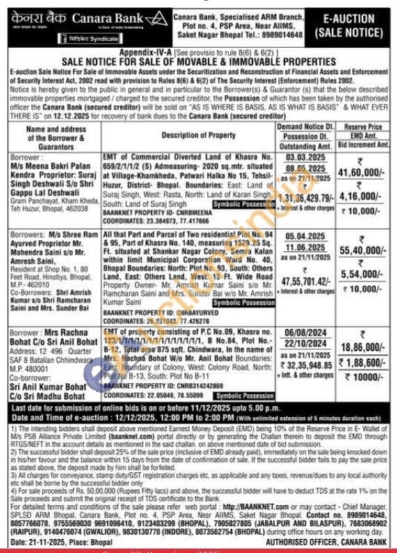 EMT of Commercial Diverted Land of Khasra No. 659/2/1/1/2 (5) Admeasuring- 2020 sq.mtr. situated at Village-Khamkheda, Patwari Halka No 15, Tehsil-Huzur, District- Bhopal, Boundaries: East: Land of Suraj Singh, West: Rasta, North: Land of Karan Singh. South: Land of Suraj Singh