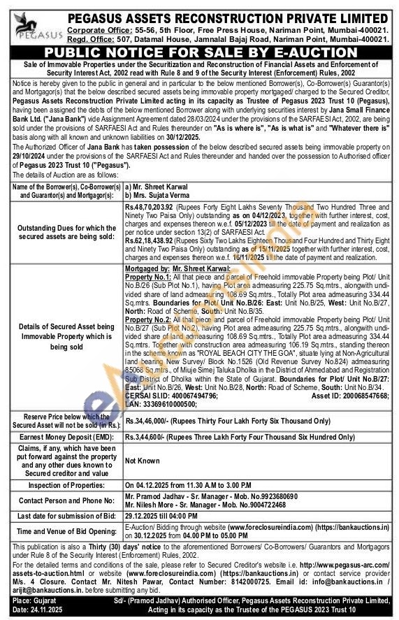 Property No.2: All that piece and parcel of Freehold immovable Property being Plot/ Unit No.B/27 (Sub Plot No.2), having Plot area admeasuring 225.75 Sq.mtrs., alongwith undi-vided share of land admeasuring 108.69 Sq.mtrs., Totally Plot area admeasuring 334.44 Sq.mtrs. Together with construction area admeasuring 106.19 Sq.mtrs., standing thereon in the scheme known as "ROYAL BEACH CITY THE GOA", situate lying at Non-Agricultural land bearing New Survey/ Block No.1526 (Old Revenue Survey No.824) admeasuring 85068 Sq.mtrs., of Miuje Simej Taluka Dholka in the District of Ahmedabad and Registration Sub District of Dholka within the State of Gujarat. Boundaries for Plot/ Unit No.B/27: East: Unit No.B/26, West: Unit No.B/28, North: Road of Scheme, South: Unit No.B/34