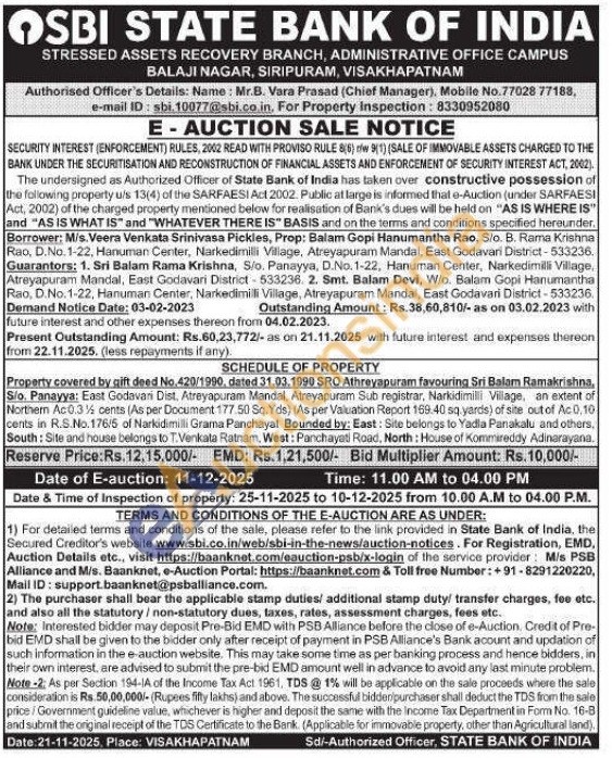 Authorised Officer's Details: Name: Mr.B. Vara Prasad (Chief Manager), Mobile No.77028 77188