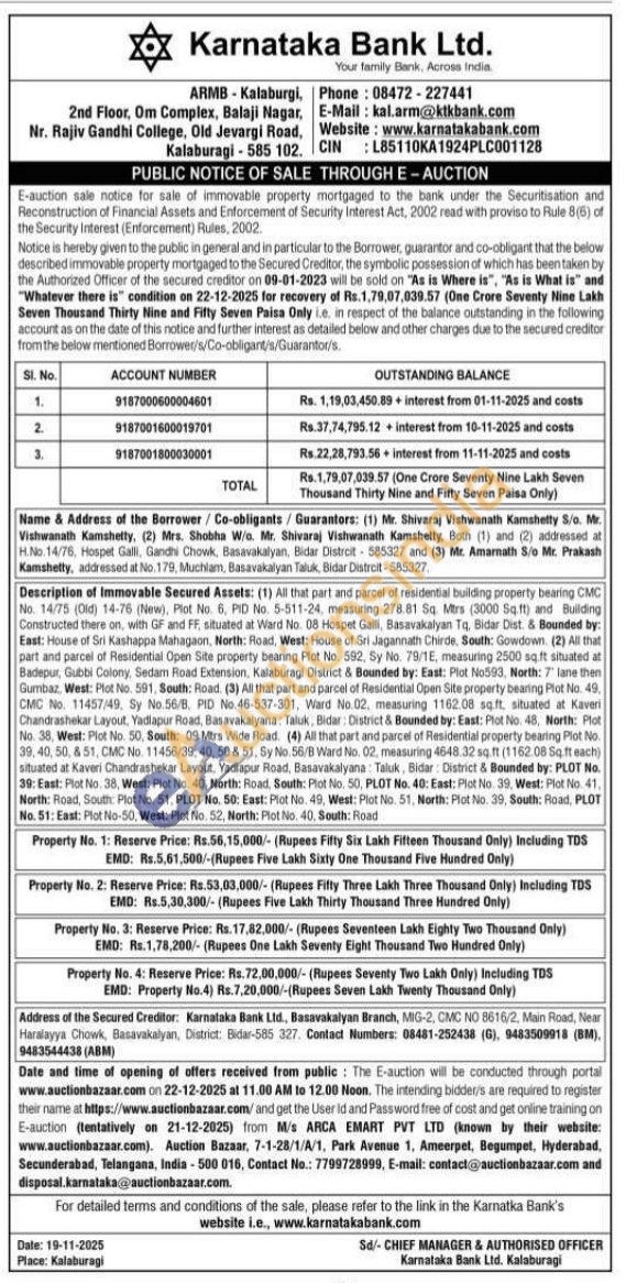 All that part and parcel of Residential Open Site property bearing Plot No. 49, CMC No. 11457/49, Sy No.56/B, PID No. 46-537-301, Ward No.02, measuring 1162.08 sq.ft. situated at Kaveri Chandrashekar Layout, Yadlapur Road, Basavakalyana: Taluk, Bidar: District & Bounded by: East: Plot No. 48, North: Plot No. 38, West: Plot No. 50, South: 09 Mtrs Wide Road.