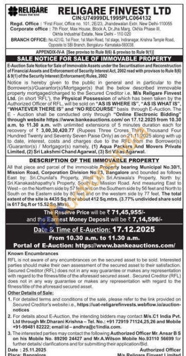 All that piece and parcel of the immovable Property bearing Municipal No.30/1, Mission Road, Corporation Division No.73, Bangalore and bounded as follows East by: Sri.Chonillal's Property, West by: Sri.Arsiwala's Property, North by: Sri. Kanakasbhapathy's Property, South by: Mission Road. And measuring East to West-on the Northern side by 57 feel and on the Southern side by 56 feet and North to South on the Eastern side by 80 feet and on the western side by 77 feet. The total extent of the site is 4435 Sq.ft or about 412 Sq.mtrs. (3.77% undivided share sold is 617 Sq.ft or 15.52 Sq.Mtrs).