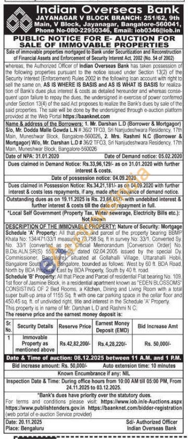 Schedule 'A' Property: All that piece and parcel of the property bearing BBMP Khata No: 134/471/33/1 measuring 73,758 Sq. It in survey No: 33/1, Converted Sy No. 33/1 (converted as per Official Memorandum (Conversion Order] No. B.Dis. ALN SR(S) 553/2004-05, dated 02.04.2005 issued by the special Dy Commissioner, Bangalore), situated at Gollahalli Village, Uttarahalli Hobli, Bangalore South Taluk, Bangalore, bounded as follows. West by 60 ft. BDA Road. North by BDA Property, East by BDA Property, South by 40 ft. road. Schedule 'B' Property: All that Piece and Parcel of residential Flat bearing No. 109. 1st floor of Jasmine Block, in a residential apartment known as "EDEN BLOSSOMS CONSISTING OF 2 Bed Rooms, a Kitchen, Dining and Living Room with a total super built-up area of 1155 Sq. ft with one car parking space in the cellar floor and 450.45 sq. ft. of undivided right, title and interest in the Schedule 'A' Property This property is in name of Mr. Darshan LD and Rashmi N C