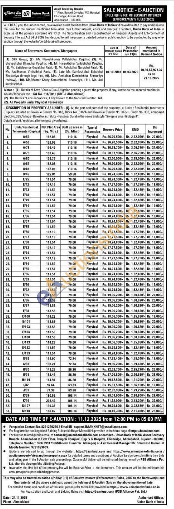 All the part and parcel of the property i.e. Units/Residential tenements (Duplex) situated at Revenue Survey No. 348, Block No. 336/A and Revenue Survey No. 348/1, Block No. 335, combined Block No.335, Village-Baleshwar, Taluka - Palsana, Surat in the name and style "Swapna Srushti Elegant". Details of unit/residential tenements given below.
