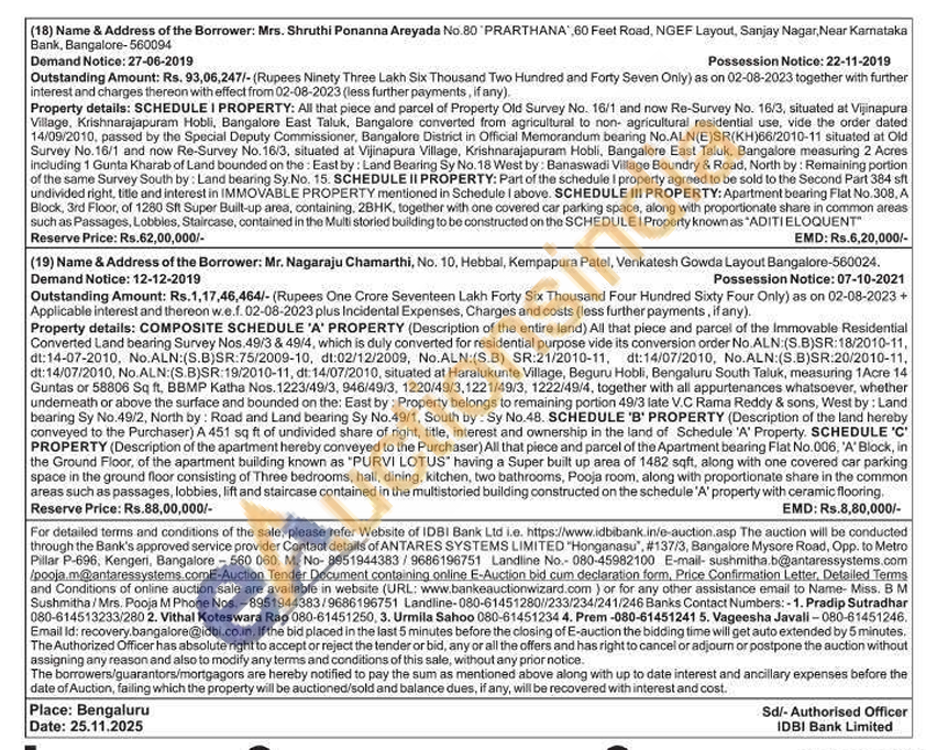 13) All that piece and parcel of Residential Converted Land Bearing Sy. No.73/5 measuring 1 Acre 17 Guntas and Residential Converted Land Bearing Sy. No.73/6 measuring 21 Guntas both the properties totally measuring 1 Acre 38 Guntas, (converted vide Official Memorandum dated 6/7/2013, bearing No.ALN(EVH)SR/443/2012-13, issued by Deputy Commissioner, Bangalore District Bangalore), Presently Bruhat Bangalore Mahanagara Palike Katha No.359/73/5/73/6/17, situated at Balagere Village, Varthur Hobli, Bangalore East Taluk. Bangalore and bounded as: East by: Remaining portion of Sy. No.73/5 and 73/6; West by: Remaining portion of Sy. No.73/5 and 73/6; North by: Land bearing Sy.No.73/4; South by: Road; SCHEDULE 'B' PROPERTY-370 Sq.feet, undivided share, right, title and interest in the Schedule 'A' Property (proportionate to the Schedule C Property. SCHEDULE 'C' PROPERTY-Residential Apartment bearing No.001 in the Ground Floor, Block-B, in Wing-D, admeasuring a super built area of 1380 Square Feet, consisting of 2 Bedrooms, in the Multistoried Residential Apartment Building Known as *SRI KRISHNA EXCEL STONE", constructed over the Schedule "A" Property Inclusive of proportionate share in the common area such as passage, lobbies, lift, staircase and other areas of common area, (including half portion in depth of the joints between the Ceiling of the Apartment and floors of the apartment above it, internal and external walls between such levels) and the building is of RCC roofing as per specification appended hereto with separate electricity, common water and sanitation, including all rights, title, interest, privileges, appurtenances, together with a covered car parking space slot to be earmarked and the apartment is bounded on: East by: Corridor, West by: Open to sky: North by: Open to sky: South by: Corridor.