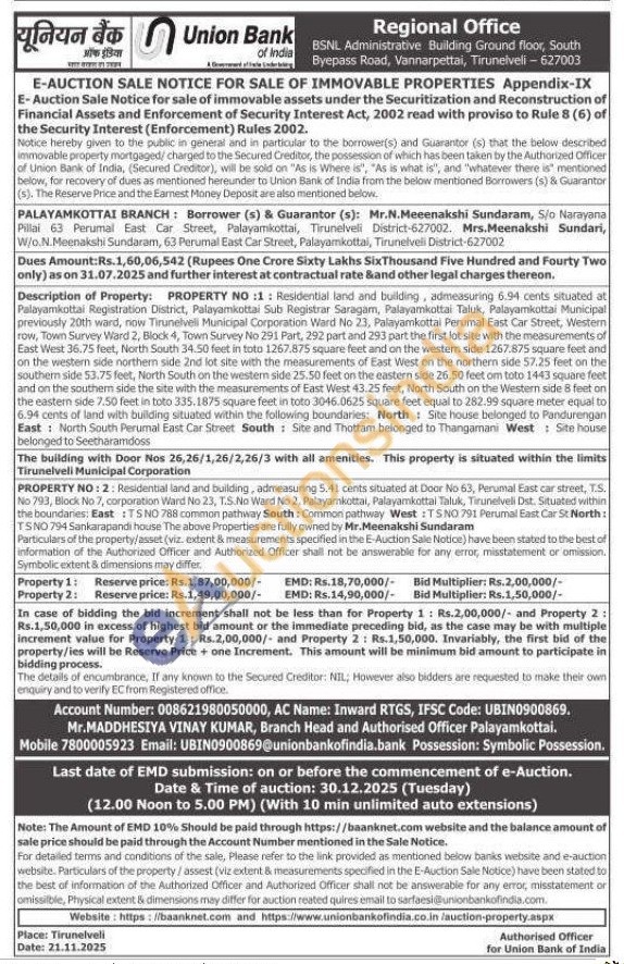 Palayamkottai Registration District, Palayamkottai Sub Registrar Saragam, Palayamkottai Taluk, Palayamkottai Municipal previously 20th ward, now Tirunelveli Municipal Corporation Ward No 23, Palayamkottai Perumal East Car Street, Western row, Town Survey Ward 2, Block 4, Town Survey No 291 Part, 292 part and 293 part the first lot site with the measurements of East West 36.75 feet, North South 34.50 feet in toto 1267.875 square feet and on the western side 1267.875 square feet and on the western side northem side 2nd lot site with the measurements of East West on the northern side 57.25 feet on the southern side 53.75 feet, North South on the western side 25.50 feet on the eastern side 26.50 feet om toto 1443 square feet and on the southem side the site with the measurements of East West 43.25 feet, North South on the Western side 8 feet on the eastern side 7.50 feet in toto 335.1875 square feet in toto 3046.0625 square feet equal to 282.99 square meter equal to 6.94 cents of land with building situated within the following boundaries: North Site house belonged to Pandurengan East: North South Perumal East Car Street South Site and Thottam belonged to Thangamani West: Site house belonged to Seetharamdoss