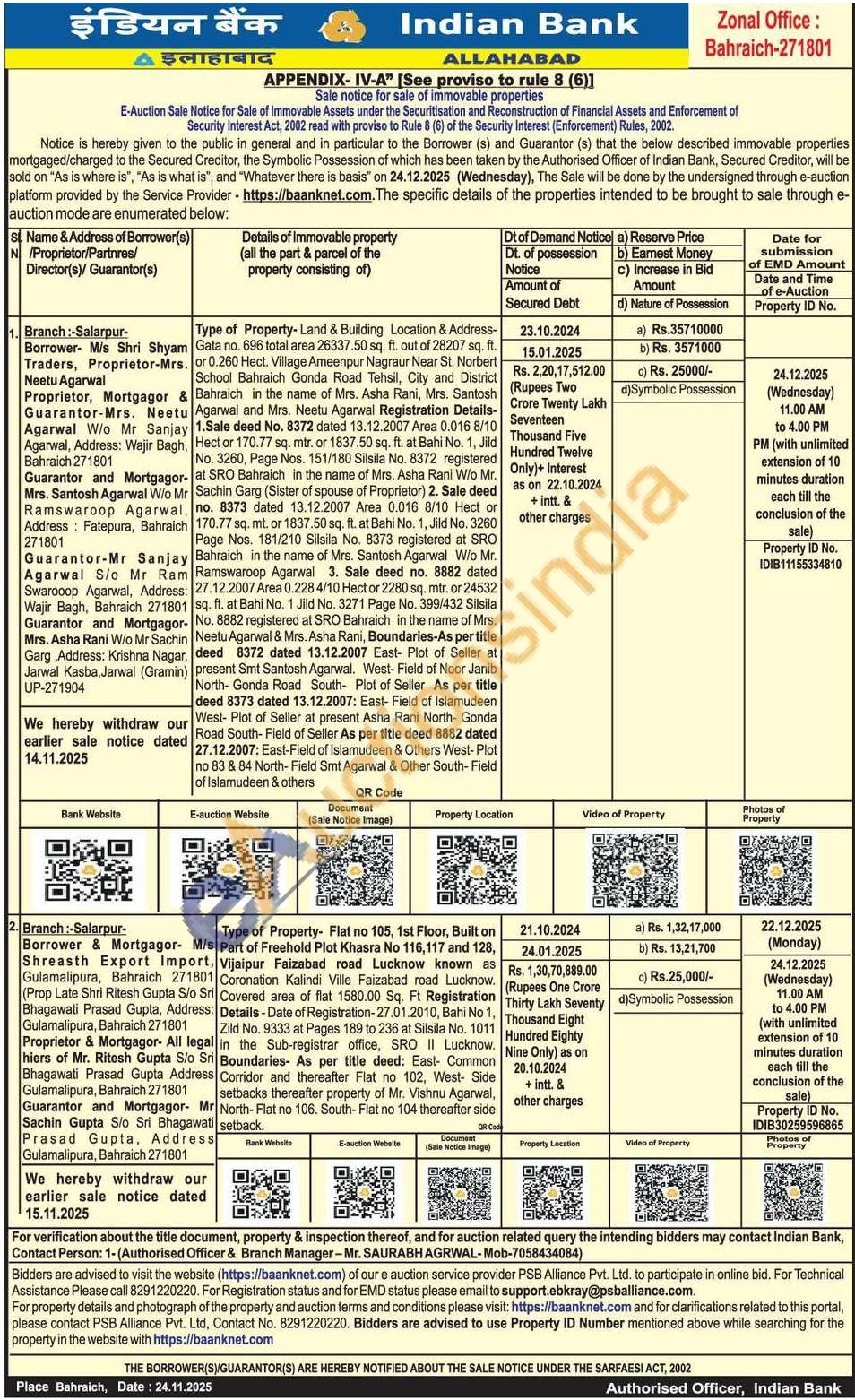 Type of Property- Flat no 105, 1st Floor, Built on Part of Freehold Plot Khasra No 116,117 and 128, Vijaipur Faizabad road Lucknow known as Coronation Kalindi Ville Faizabad road Lucknow. Covered area of flat 1580.00 Sq. Ft Registration Details-Date of Registration-27.01.2010, Bahi No 1. Zild No. 9333 at Pages 189 to 236 at Silsila No. 1011 in the Sub-registrar office, SRO II Lucknow. Boundaries- As per title deed: East- Common Corridor and thereafter Flat no 102. West- Side setbacks thereafter property of Mr. Vishnu Agarwal, North-Flat no 106, South-Flat no 104 thereafter side setback.