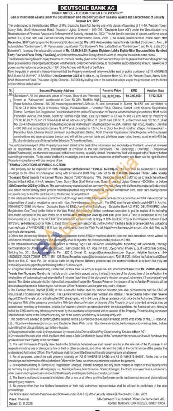 All that piece and parcel of House, Ground and Premises 1 known as "Aishwaryam" constructed at Door No.25A, Redhills High Road, Kolathur, Chennai-600 099 measuring an extent of 32264 Sq Ft., and comprised in Survey No 67/7 and correlated to TS. No.74 in Block No.34 of Kolathur Vilage, Purasawalkam-Perambur Taluk, Chennai District, North Chennai Registration District, Sembiam Sub Registration District and within the limits of Corporation of Chennai with the following boundaries: North by S Perundevi Avenue 2nd Street, South by Redhills High Road, East by Property in TS No.75 and 76 and West by: Property in T.S. No.60,70,71,72 and 73. Schedule B: AFlat, admeasuring 740 sq. ft., (plinth area 638 Sq. ft., and common area 102 Sq. ft.) Flat No. CS-4 in the second floor of the building known as "Aishwaryam" situated at Door No. 25A, Redhills High Road, Kolathur, Chennai 600 099 and comprised in Survey No 6717 and comelated to T.S.No.74 in Block No.34 of Kolathur Village, Purasawalkam Perambur Taluk, Chennai District Sembium Sub Registration District, North Chennai Registration District together with the present constructions and superstructures thereon and with all the common rights and privileges appernating thereto together with 462 Sq ft of undivided share of interest in the Schedule "A" mentioned land.