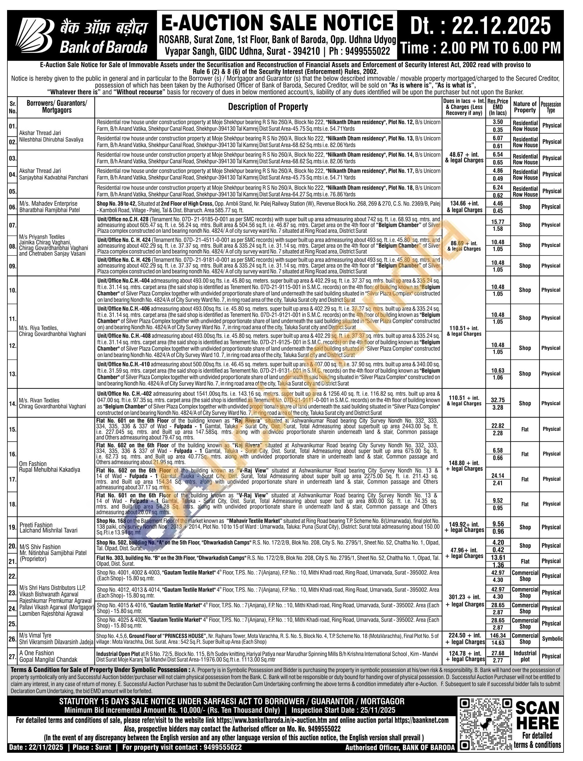 Flat No. 601 on the 6th Floor of the building known as "V-Raj View" situated at Ashwanikumar Road bearing City Survey Nondh No. 13 & 14 of Wad Fulpada 1 Gamtal, Taluka Surat City, Dist. Surat, Total Admeasuring about super built up area 800.00 Sq. ft. i.e. 74.35 sq. mtrs. and Built up area 54.28 Sq. mtrs. along with undivided proportionate share in underneath land & stair, Common passage and Others admeasuring about 20.07 sq. mtrs.