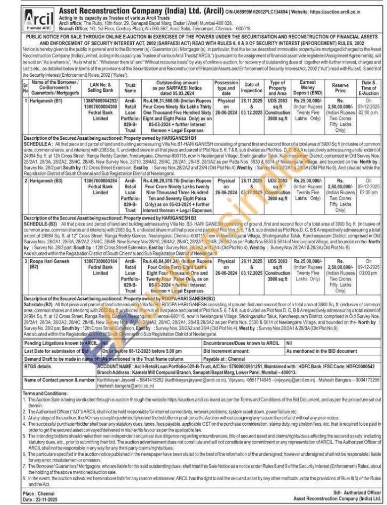 Schedule-(82) All that piece and parcel of land admeasuring Vila No.82-ROOPA HARI GANESH consisting of ground, first and second floor of a total area of 2000 Sq. ft. (inclusive of common area, common shares and interiors) with 2083 Sq ft undivided share in all that piece and parcel of Plot Nos 5.6.788. sub divided as Pict Nos D. C, B & Arespectively admeasuring a total extent of 24994 Sq. ft. at 12 Cross Street. Ranga Reddy Garden, Neelangarai, Chennai-600115, now in Neelangarai Village, Sholinganallur Taluk, Kancheepuram District, comprised in Old Survey Nos. 28/241, 28/34, 28/2A2 28/4C, 28:48, New Survey Nos. 28/10, 28/442, 284C, 28/241, 25/48 28/3A2 as per Patta Nos. 5530 & 5614 of Neelangarai Village, and bounded on the North by Survey No 28/2 par, South by: 12th Cross Street Extension, East by: Survey Nos. 282A2 and 28/4 (Old Plot No.4), West by: Survey Nos 28/241 & 28/3A (Old Plot No.9) And situated within the Registration District of South Chennai and Sub Registration District of Neelangaral
