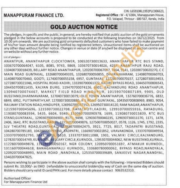 Manappuram Finance Ltd Gold Auctions Auction in Anantapur