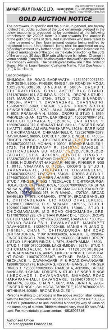 Manappuram Finance Ltd Gold Auctions Auction in Shivamogga
