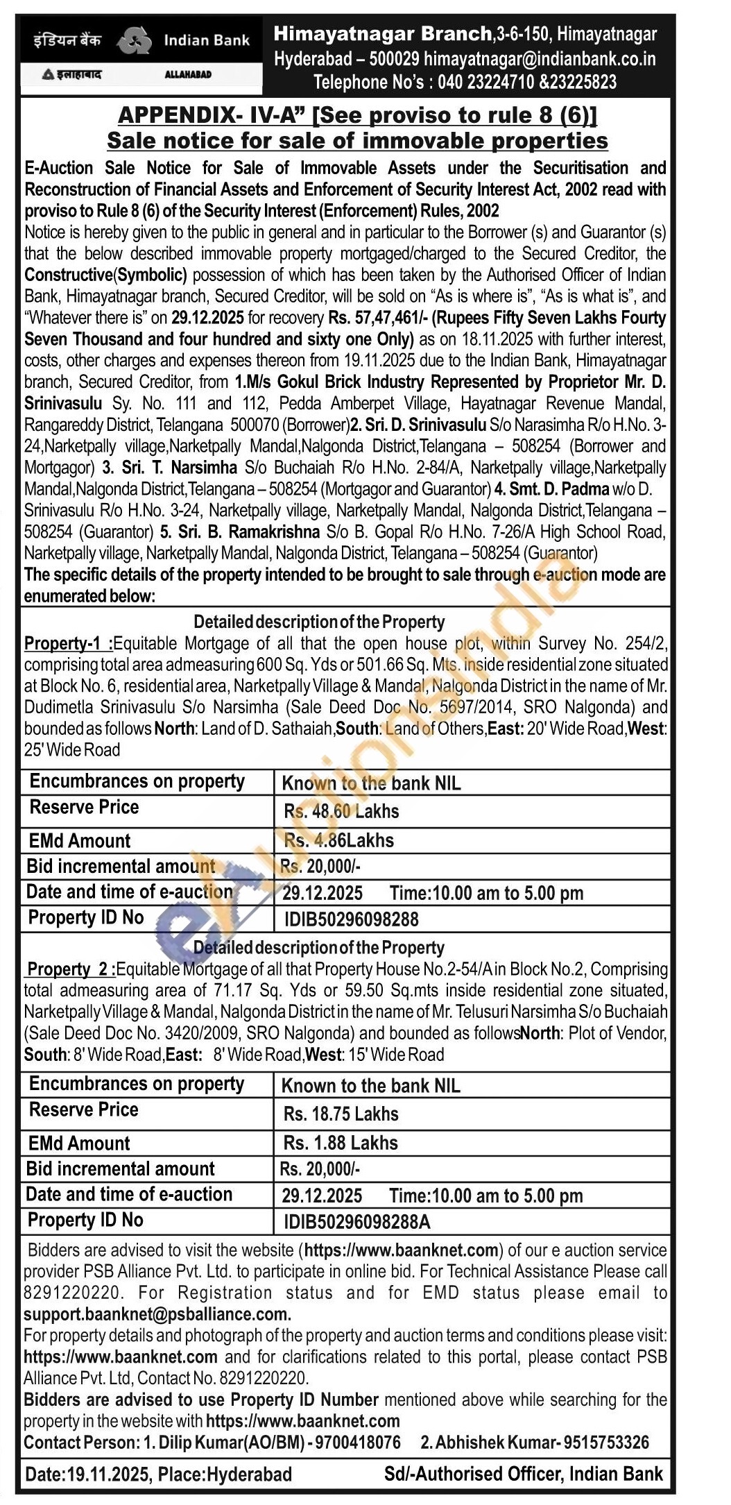 Property 2: Equitable Mortgage of all that Property House No.2-54/Ain Block No.2, Comprising total admeasuring area of 71.17 Sq. Yds or 59.50 Sq.mts inside residential zone situated, Narketpally Village & Mandal, Nalgonda District in the name of Mr. Telusuri Narsimha S/o Buchaiah (Sale Deed Doc No. 3420/2009, SRO Nalgonda) and bounded as followsNorth: Plot of Vendor, South: 8' Wide Road East: 8' Wide Road, West: 15' Wide Road