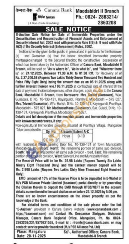 Non-agricultural Immovable property situated at Pranthya Village, Mangalore Taluk comprised in Sy. No186. SD No. 2F Kissam Hosa Extent A-C 0-19 with residential house bearing Door No. 10-130-131 of Town Muncipality Moodabidri. Boundaries: North: The remaining portion of same sub division, South: The remaining portion of same sub division-road, East: The remaining portion of same sub division, West: Survey Line and Muncipality Road.