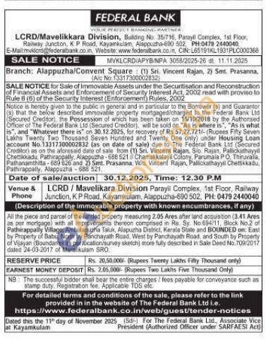 All the piece and parcel of the landed property measuring 2.05 Ares after land acquisition (3.41 Ares as per mortgage) with all improvements thereon comprised in Re S. No 694/11, Block No.2 of Pathirappally Village, Ambalapuzha Taluk, Alapuzha District, Kerala State and BOUNDED on. East by Property of Babu, North by Panchayath Road, West by Panchayath Road, and South by Property of Vijayan (Boundaries (Boundaries as per location/survey sketch) more fully described in Sale Deed No. 709/2017 dated 24-03-2017 of Marankulam SRO