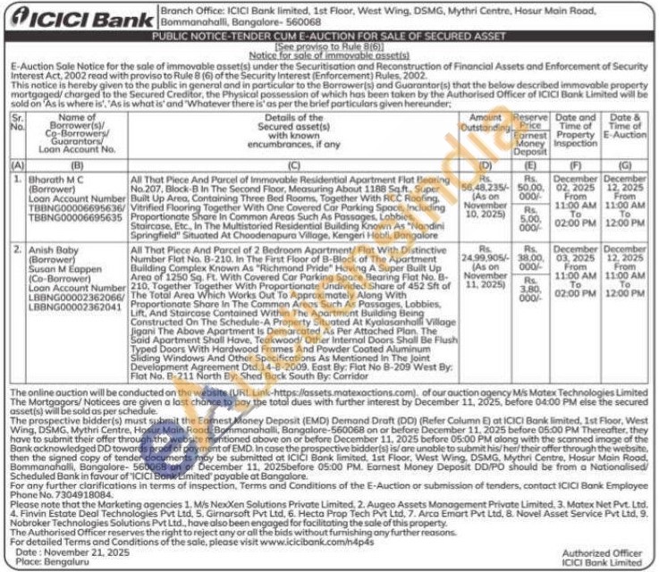 All That Piece And Parcel of 2 Bedroom Apartment/Flat With Distinctive Number Flat No. B-210. In The First Floor of B-Block of The Apartment Building Complex Known As "Richmond Pride" Having A Super Built Up Area of 1250 Sq. Ft. With Covered Car Parking Space Bearing Flat No. B-210. Together Together With Proportionate Undivided Share of 452 Sft of The Total Area Which Works Out To Approximately Along With Proportionate Share In The Common Areas Such As Passages, Lobbies, Lift, And Staircase Contained Within The Apartment Building Being Constructed On The Schedule-A Property Situated At Kyalasanhalli Village Jigani The Above Apartment is Demarcated As Per Attached Plan, The Said Apartment Shall Have, Teakwood/Other Internal Doors Shall Be Flush Typed Doors With Hardwood Frames And Powder Coated Aluminum Sliding Windows And Other Specifications As Mentioned in The Joint Development Agreement Dtd.14-8-2009. East By: Fiat No 8-209 West By: Flat No. B-211 North By: Shed Back South By: Corridor