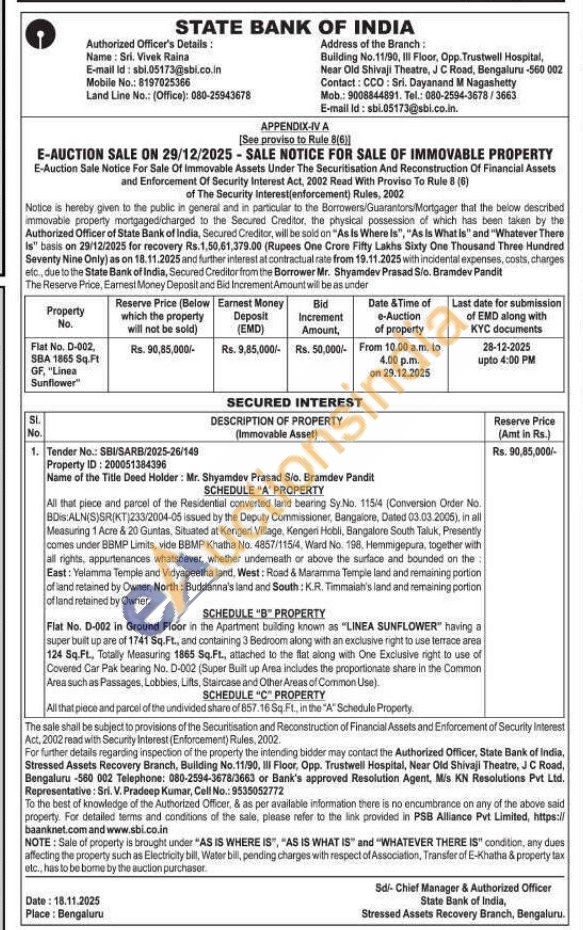 All that piece and parcel of the Residential converted land bearing Sy.No. 115/4 (Conversion Order No. BDIS:ALN(S)SR(KT)233/2004-05 issued by the Deputy Commissioner, Bangalore, Dated 03.03.2006), in all Measuring 1 Acre & 20 Guntas, Situated at Kengeri Village, Kengeri Hobli, Bangalore South Taluk, Presently comes under BBMP Limits, vide BBMP Khatha No. 4857/115/4, Ward No. 198. Hemmigepura, together with all rights, appurtenances whatsoever, whether underneath or above the surface and bounded on the East: Yelamma Temple and Vidyapeetha land, West: Road & Maramma Temple land and remaining portion of land retained by Owner, North: Buddanna's land and South: K.R. Timmaiah's land and remaining portion of land retained by Owner. SCHEDULE "B" PROPERTY Flat No. D-002 in Ground Floor in the Apartment building known as "LINEA SUNFLOWER" having a super built up are of 1741 Sq.Ft., and containing 3 Bedroom along with an exclusive right to use terrace area 124 Sq.Ft., Totally Measuring 1865 Sq.Ft., attached to the flat along with One Exclusive right to use of Covered Car Pak bearing No. D-002 (Super Built up Area includes the proportionate share in the Common Area such as Passages, Lobbies, Lifts, Staircase and Other Areas of Common Use