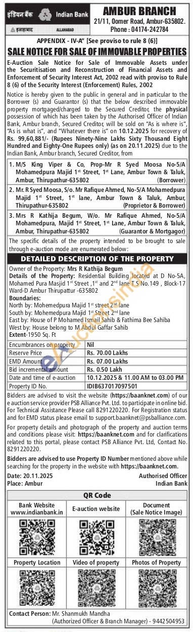Details of the Property: Residential Building located at D No-5A, Mohamed Pura Masjid 1 Street, 1 and 2 lane T S No.149, Block-17 Ward-D Ambur Thirupattur-635802