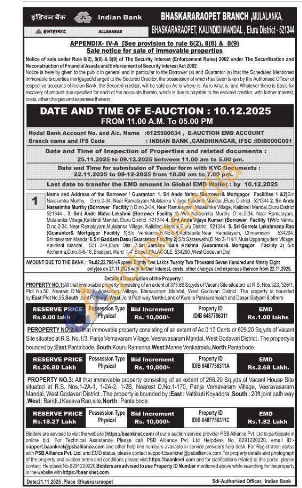 PROPERTY NO.3: All that immovable property consisting of an extent of 266.20 Sq.yds of Vacant House Site situated at R.S. Nos. 1-2A-1, 1-2A-2, 1-2B. Nearest D.No.1-170, Panja Vemavaram Village, Veeravasaram Mandal, West Godavari District. The property is bounded by: East: Vattikuti Koyadora, South: 20ft joint path way West: Bandi J.Kesava Rao, site, North: Panta bode