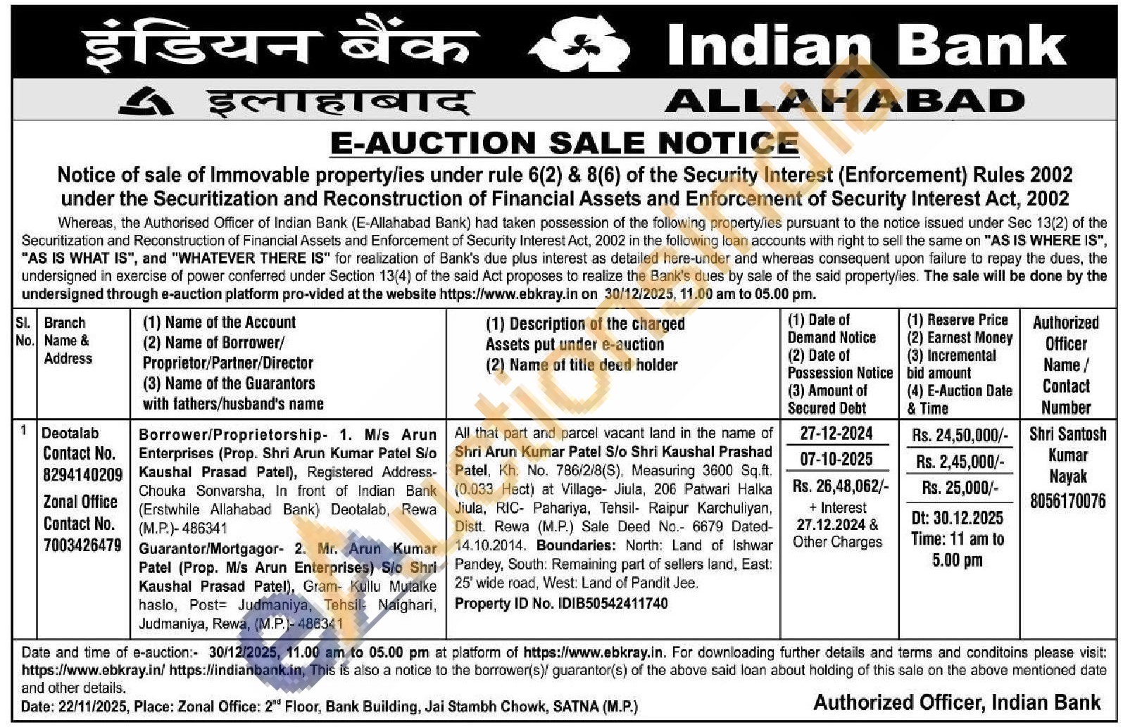 All that part and parcel vacant land in the name of Shri Arun Kumar Patel S/o Shri Kaushal Prashad Patel, Kh. No. 786/2/8(S), Measuring 3600 Sq.ft. (0.033 Hect) at Village Jiula, 206 Patwari Halka Jiula, RIC- Pahariya, Tehsil Raipur Karchuliyan, Distt. Rewa (M.P.) Sale Deed No. 6679 Dated-14.10.2014. Boundaries: North: Land of Ishwar Pandey, South: Remaining part of sellers land, East: 25' wide road, West: Land of Pandit Jee.
